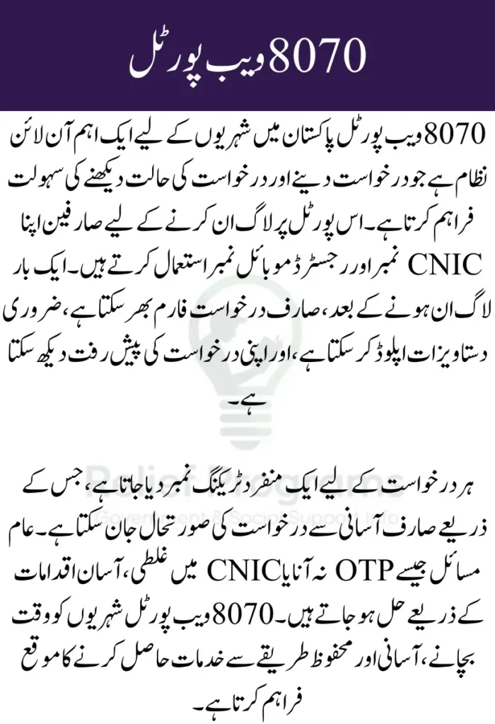 The 8070 Web Portal is Pakistan’s official online system that allows citizens to submit applications, track their status, and access government services digitally. By logging in with your CNIC (Computerized National Identity Card) and registered mobile number, you can apply for various services and check the progress of your requests from home.