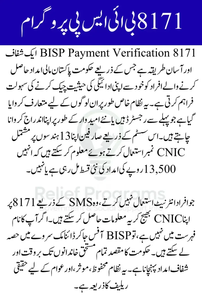 The 8171 BISP payment verification system is a secure online method to check if your name is listed among the beneficiaries of the latest BISP installment. The process uses your CNIC to confirm your eligibility and payment status. This digital verification system eliminates the need to visit government offices, saving time and travel costs for low-income families.