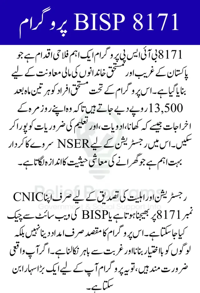 8171 بی آئی ایس پی پروگرام کا مقصد ایسے خاندانوں کو مالی مدد فراہم کرنا ہے جو غربت کا شکار ہیں۔ یہ پروگرام خاص طور پر ان افراد کے لیے ہے جو روزگار سے محروم، بیوہ خواتین، یا معذور ہیں۔ آپ صرف اپنا قومی شناختی کارڈ نمبر 8171 پر بھیج کر اپنی اہلیت چیک کر سکتے ہیں۔