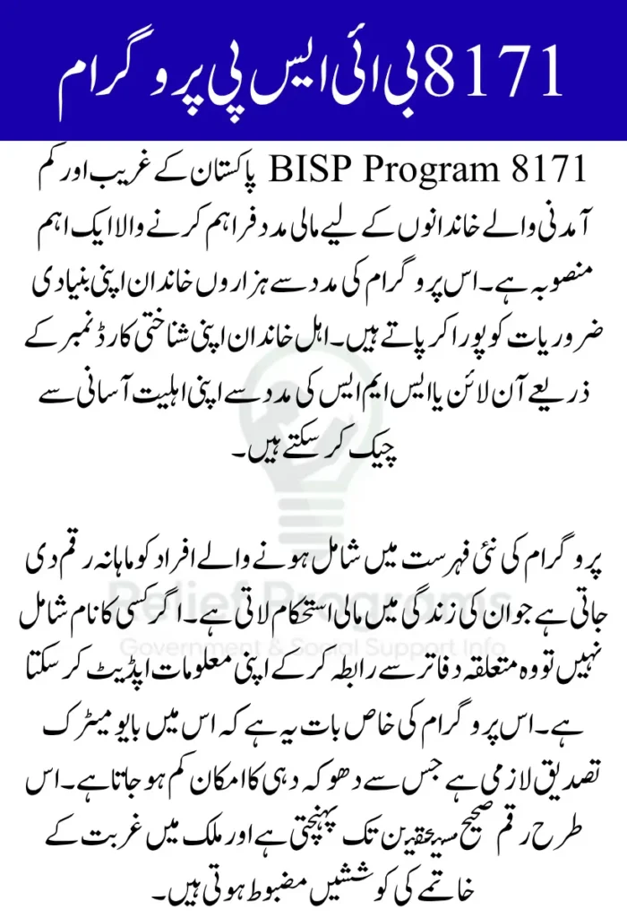 The 8171 BISP Program is a government initiative aimed at reducing poverty by providing cash grants to deserving families. It specifically targets households that lack stable income or government support. This initiative has played a significant role in improving the quality of life for millions across Pakistan.