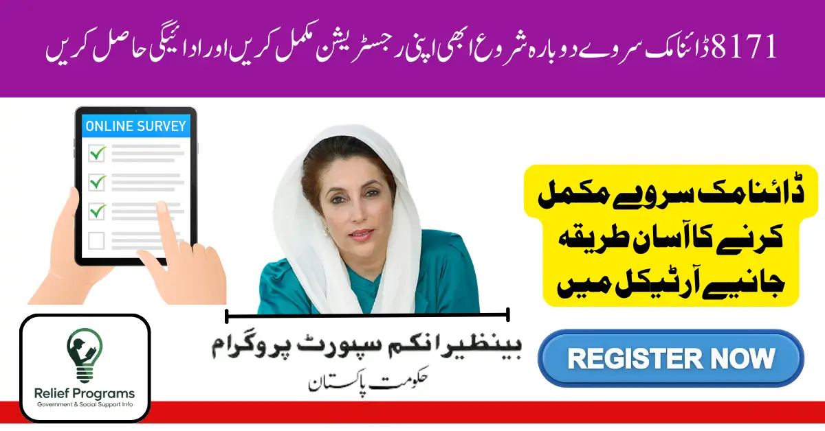 بینظیر انکم سپورٹ پروگرام کے تحت 8171 ڈائنامک سروے کی مدد سے نقد امداد فراہم کی جاتی ہے۔ اس عمل میں 13500 ہیلپ لائن بھی مددگار ثابت ہوتی ہے جہاں سے لوگ معلومات حاصل کر سکتے ہیں اور اپنی رجسٹریشن کی تفصیلات اپ ڈیٹ کر سکتے ہیں۔