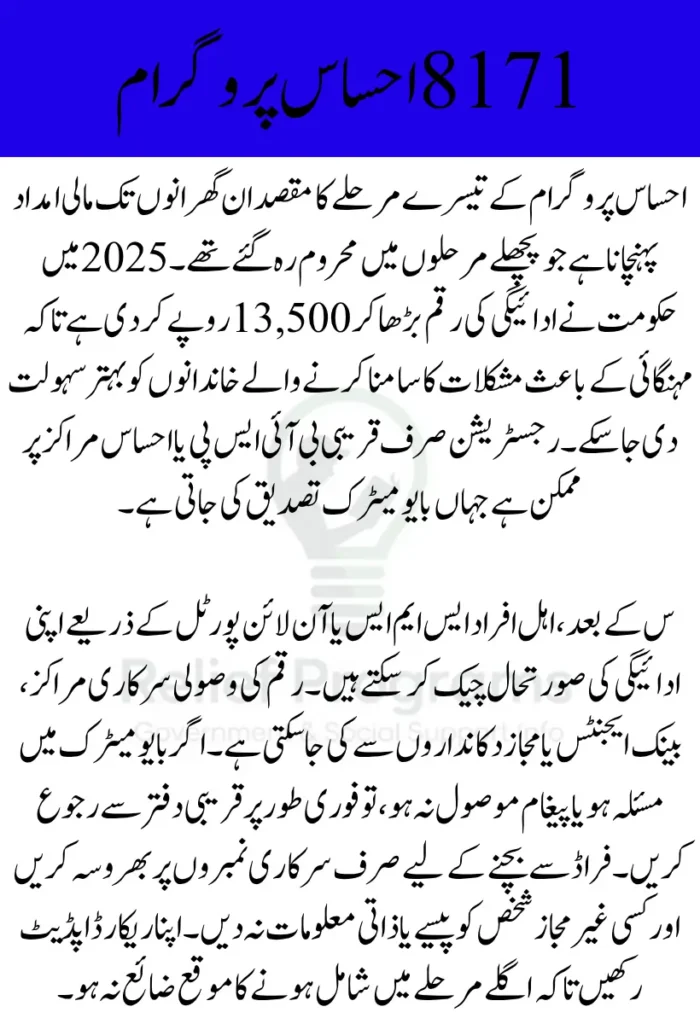 8171 Ehsaas Program Phase 3 Payments are more than just temporary financial relief — they are a vital part of Pakistan’s broader effort to protect its most vulnerable citizens. If you or someone you know qualifies, act early, follow the correct procedure, and avoid shortcuts.