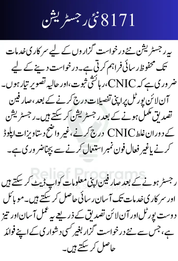 8171 New Registration is designed for individuals registering for the first time to gain access to government services. The system verifies personal details through CNIC authentication and ensures that only eligible users can proceed. This process allows applicants to manage their profiles, update information, and access official services securely. First-time registration reduces manual paperwork and provides a streamlined digital experience.