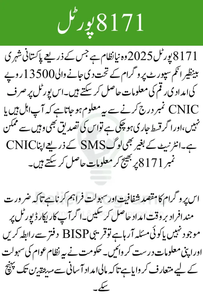 8171 پورٹل اگست 2025 ایک جدید آن لائن پلیٹ فارم ہے جو حکومت پاکستان نے بینظیر انکم سپورٹ پروگرام کے مستحقین کے لیے متعارف کروایا ہے۔ اس کے ذریعے افراد اپنا CNIC درج کر کے یہ معلوم کر سکتے ہیں کہ وہ 13500 روپے کی قسط کے لیے اہل ہیں یا نہیں۔ یہ سسٹم وقت کی بچت کرتا ہے اور لوگوں کو دفاتر کے چکر لگانے سے بچاتا ہے۔