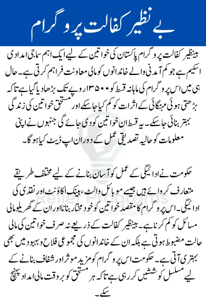 بینظیر کفالت پروگرام کے تحت مالی امداد کی رقم میں حال ہی میں اضافہ کیا گیا ہے۔ نئی قسط ۱۳۵۰۰ روپے مقرر کی گئی ہے جو پچھلی ۱۲۰۰۰ روپے کی قسط سے زیادہ ہے۔ اس اضافہ کا مقصد مستحق خواتین کی زندگیوں میں بہتری لانا ہے تاکہ وہ مہنگائی کے دباؤ کو کم کر سکیں۔ بینظیر کفالت کی یہ قسط صرف ان خواتین کو دی جائے گی جنہوں نے حالیہ تصدیقی عمل کے دوران اپنی معلومات اپ ڈیٹ کی ہوں گی۔