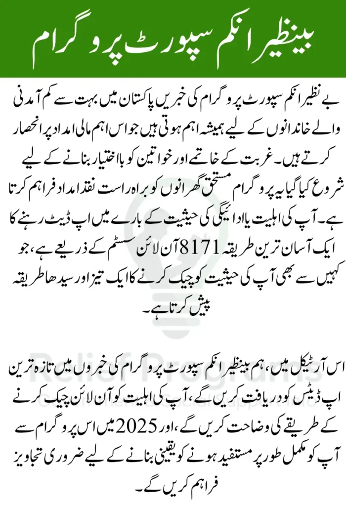 بینظیر انکم سپورٹ پروگرام نیوز پاکستان کے غریب خاندانوں کے لیے زندگی بچانے والا منصوبہ ہے۔ اس پروگرام کے تحت حکومت مالی امداد فراہم کرتی ہے تاکہ مستحق خواتین اور کم آمدنی والے خاندان اپنے ضروریات زندگی پوری کر سکیں۔ 8171 کے ذریعے اپنی اہلیت چیک کرنا آسان اور محفوظ طریقہ ہے جو ہر فرد کے لیے دستیاب ہے۔
