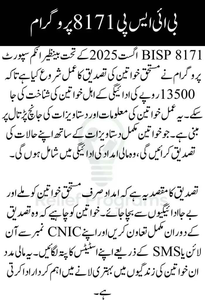 BISP 8171 refers to a specific list of female beneficiaries under the Benazir Income Support Programme scheduled for verification this August. It highlights women identified for receiving the 13500 PKR monthly financial assistance designed to ease economic hardships faced by vulnerable families.