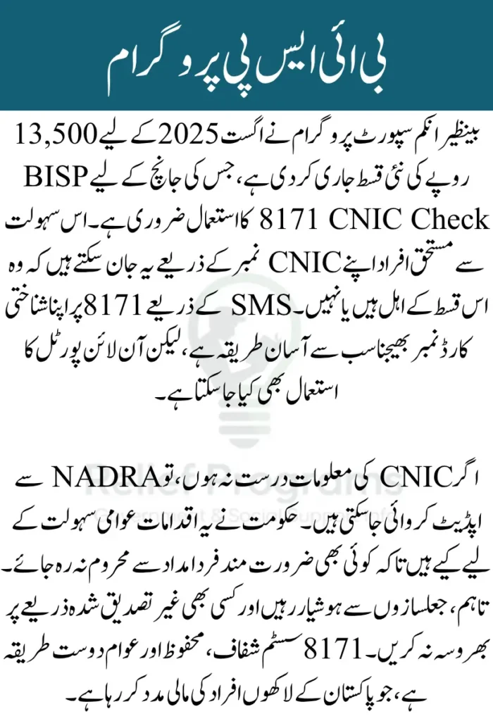 The BISP 8171 CNIC Check is a powerful tool that gives you control over your eligibility and payment status. With the 2025 update, the system has become even more reliable and easier to use. By staying alert, using official platforms, and keeping your CNIC information updated, you can receive your Rs. 13,500 payment without any issues. As always, the success of this support system depends on awareness, honesty, and your active participation in the process.
