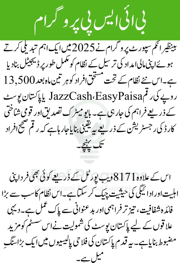 If a payment doesn’t arrive on time or a user faces issues with mobile wallet setup, dedicated help desks and BISP offices across the country are available. Users can also get updates via SMS or the 8171 portal.