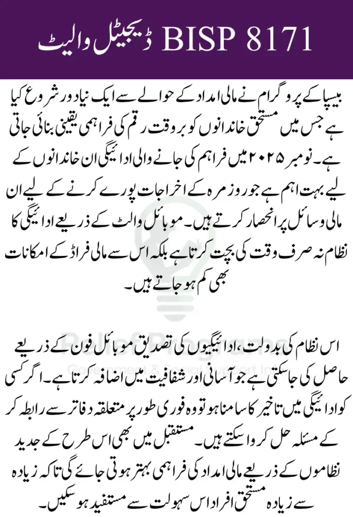 BISP 8171 Digital Wallet payment system marks a significant milestone in making social welfare payments more efficient and accessible in Pakistan. By shifting to digital transfers, BISP has reduced delays, increased transparency, and provided beneficiaries with a safer, more convenient way to receive their funds.