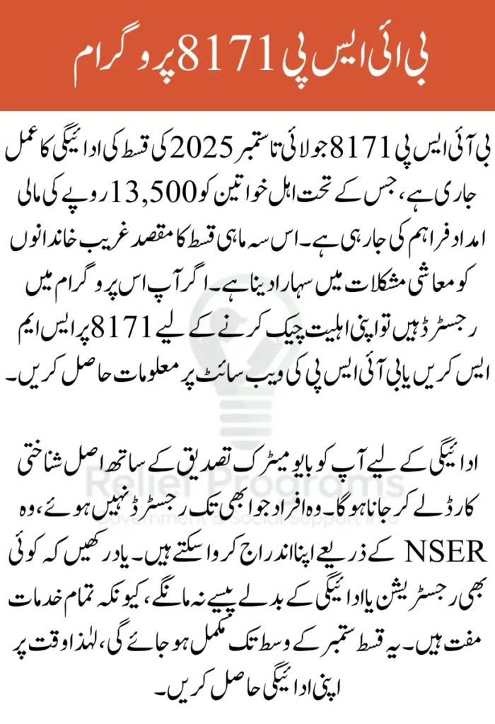 بی آئی ایس پی 8171 کی قسط کے تحت اہل افراد کو 13,500 روپے دیے جا رہے ہیں۔ یہ امدادی رقم حکومت کی جانب سے غریب اور مستحق خواتین کو ان کے گھر کے روزمرہ اخراجات میں مدد فراہم کرنے کے لیے دی جاتی ہے۔ اس قسط کی ادائیگی اگست سے شروع ہو چکی ہے اور اسے مخصوص مراکز اور بینک ایجنٹس کے ذریعے دیا جا رہا ہے۔