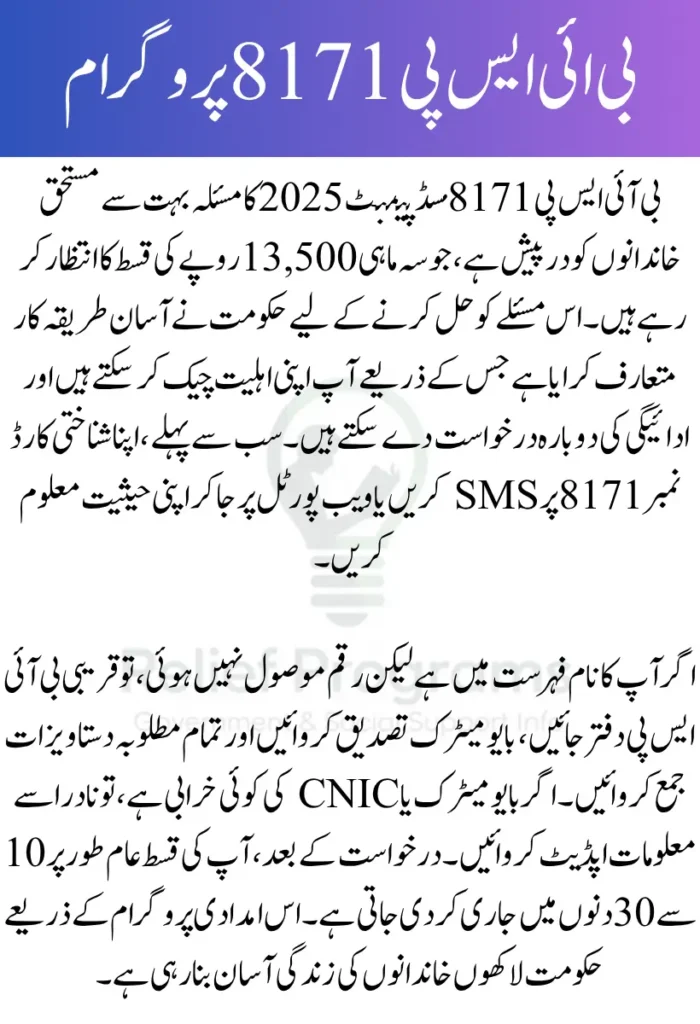 جو لوگ اب بھی بی آئی ایس پی 8171 کی قسط کے منتظر ہیں، انہیں چاہیے کہ وہ قریبی بی آئی ایس پی دفتر سے رابطہ کریں اور اپنی اصل شناختی دستاویزات کے ساتھ درخواست جمع کرائیں۔ اگر آپ اہل ہیں تو آپ کی قسط اگلے ادائیگی سائیکل میں شامل کر دی جائے گی یا جلد از جلد جاری کر دی جائے گی۔