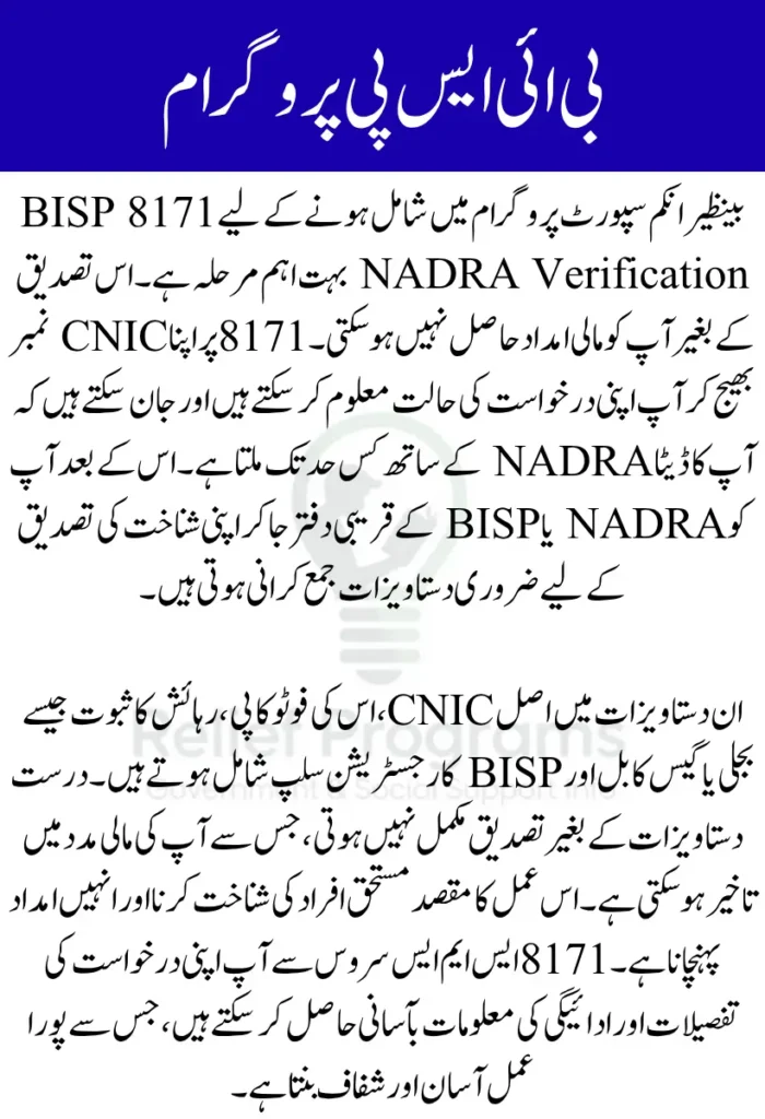 بینظیر انکم سپورٹ پروگرام میں شامل ہونے کے لیے NADRA Verification بہت ضروری ہے۔ اس عمل میں آپ کو اپنا اصل CNIC، اس کی فوٹو کاپی، اور رہائش کا ثبوت تیار رکھنا ہوتا ہے۔ 8171 نمبر پر اپنا CNIC بھیج کر آپ اپنی درخواست کی حالت جان سکتے ہیں۔ یہ سہولت آپ کو معلومات حاصل کرنے میں آسانی دیتی ہے۔