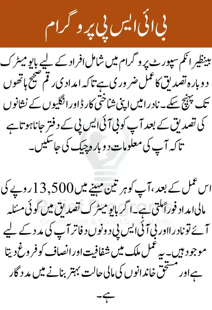 بینظیر انکم سپورٹ پروگرام کے تحت مستحق افراد کو مالی امداد فراہم کی جاتی ہے تاکہ ان کی زندگی بہتر بن سکے۔ بایومیٹرک دوبارہ تصدیق کا عمل اس بات کو یقینی بناتا ہے کہ امداد صرف صحیح افراد تک پہنچے۔ اس کے لیے نادرا کے دفاتر میں اپنا شناختی کارڈ اور فنگر پرنٹس کی تصدیق کرانی ہوتی ہے۔