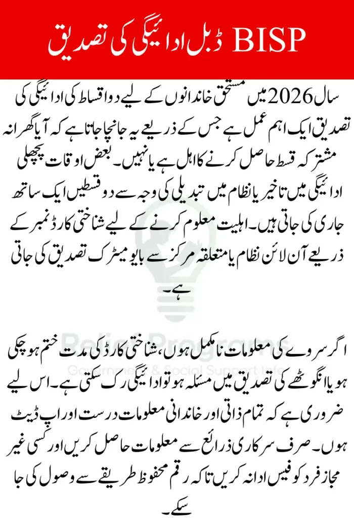 BISP Double Payment Confirmation ensures that eligible families receive combined installments when approved under the 2026 system. By checking your CNIC, keeping your survey updated, and completing biometric verification, you can confirm your eligibility without confusion. Always rely on official channels for updates and maintain accurate records to avoid delays. Taking timely action will help you secure your financial assistance smoothly and securely.