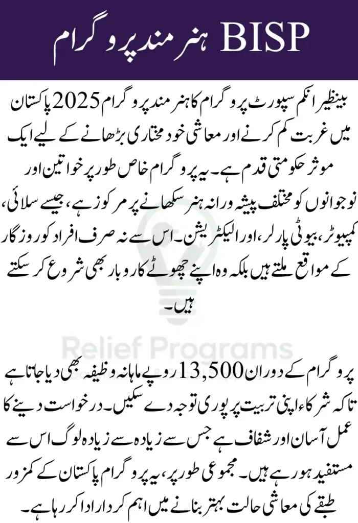 The BISP Hunarmand Program focuses on providing hands-on training in trades such as tailoring, beauty services, IT, and more. It is meant for individuals registered with BISP who are looking to enhance their skills and secure better job opportunities or start small businesses.