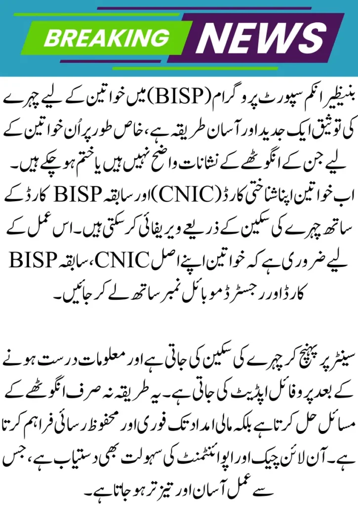 BISP Facial Verification is an efficient solution for women facing thumbprint issues. By preparing documents in advance, following the step-by-step instructions, and taking simple precautions, the process is quick, secure, and reliable. Online checks and appointment scheduling further enhance convenience, making it easier for women across Pakistan to maintain uninterrupted access to their BISP benefits.