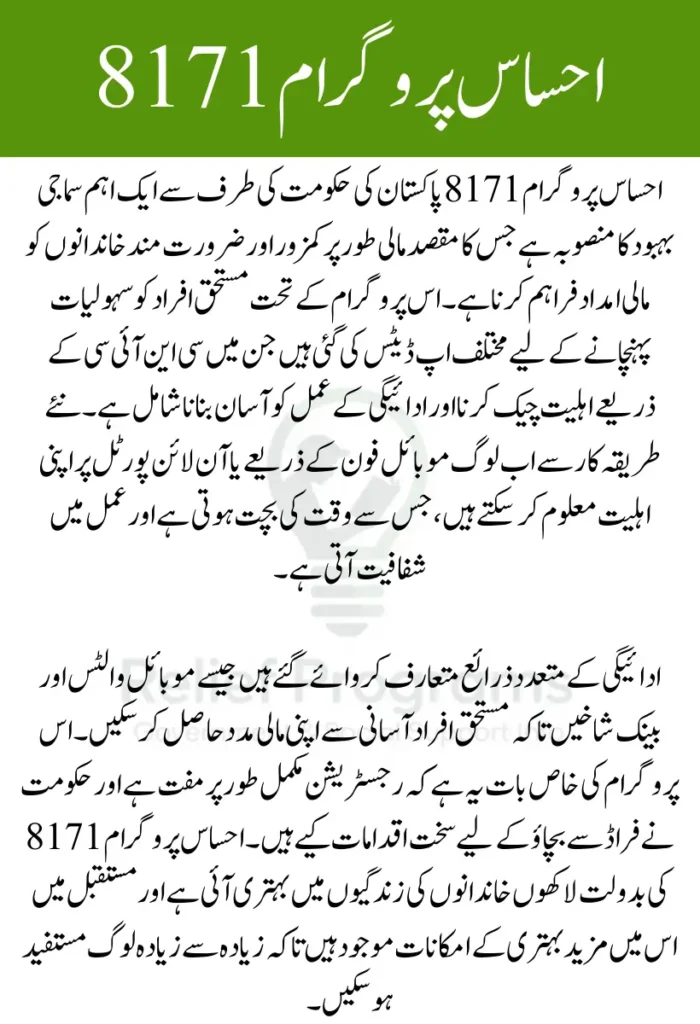 For assistance, call the helpline at 8171 or visit local centers. Trained staff can guide you through registration, eligibility checks, and payment processes under the Ehsaas Program 8171.