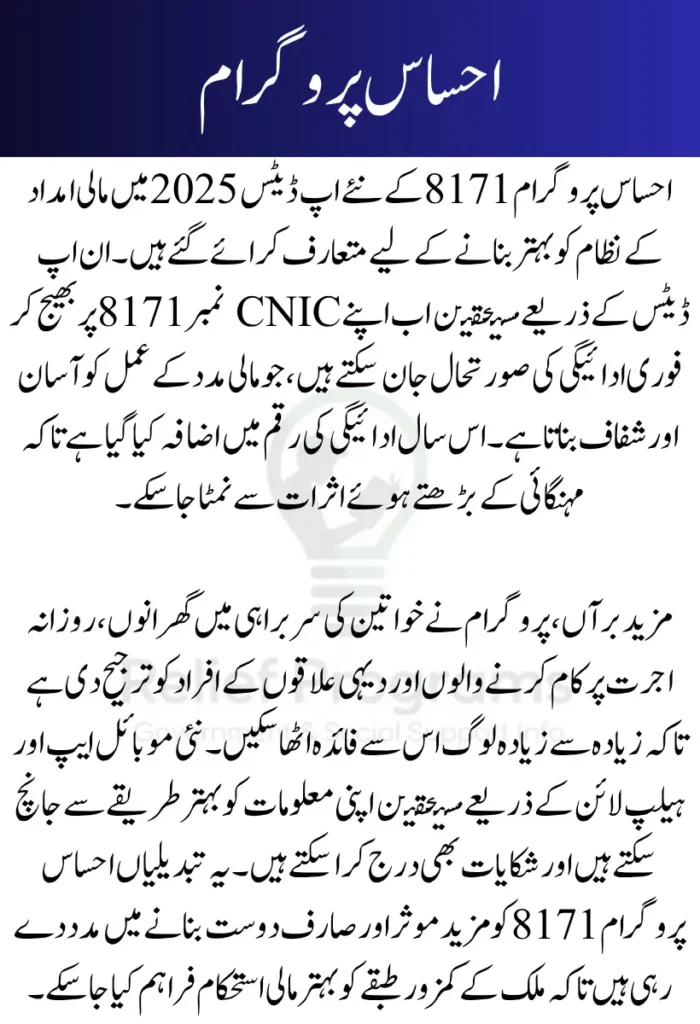 The Ehsaas Program 8171 is designed to simplify the process of delivering cash assistance to eligible families. With the new updates in 2026, the program now offers faster payment processing and clearer communication. Beneficiaries can get instant SMS alerts by sending their CNIC to 8171, making it easier to track payments and reduce delays.
