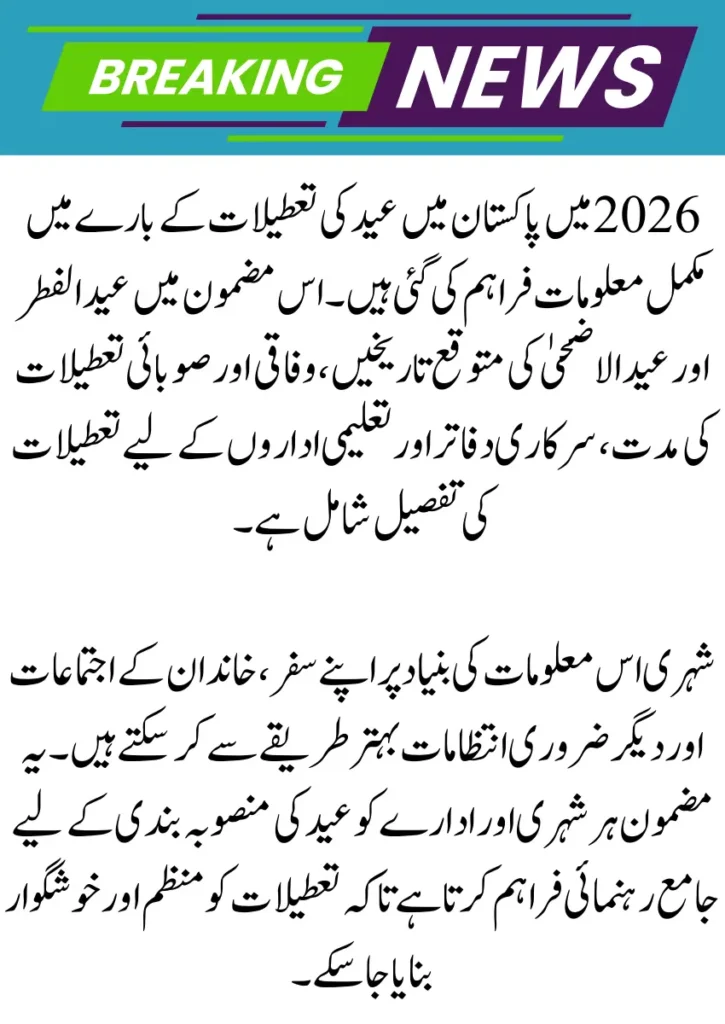The Eid Holidays 2026 Notification provides Pakistanis with the official schedule for Eid ul-Fitr and Eid ul-Adha, allowing citizens to plan celebrations, family gatherings, and travel effectively. This notification includes federal and provincial holiday schedules, the expected duration of leave, and instructions for public and private sectors.