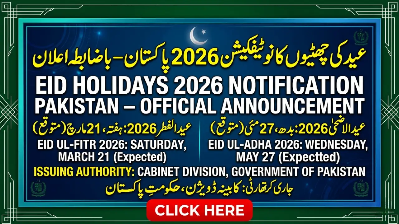 Eid ul-Adha, the Festival of Sacrifice, is expected to be observed on Wednesday, May 27, 2026. The Eid Holidays 2026 Notification usually grants several days off for public and private sector employees to perform religious rituals, visit family, and participate in community celebrations. Final confirmation depends on moon sighting reports from the Ruet-e-Hilal Committee, after which the government releases the official notification.