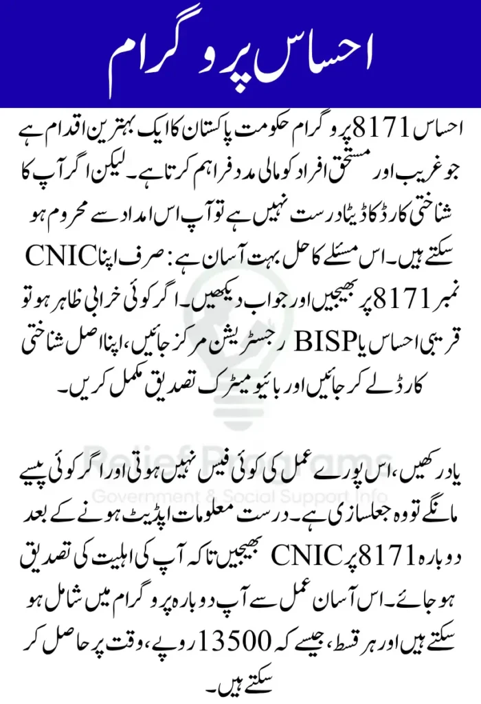 احساس 8171 پروگرام کا مقصد غریب اور مستحق خاندانوں کو مالی مدد فراہم کرنا ہے۔ اگر آپ کا شناختی کارڈ کا ڈیٹا غلط ہے یا سسٹم میں اپڈیٹ نہیں ہوا، تو آپ کو امداد نہیں ملے گی۔ ایسی صورت میں سب سے پہلے اپنے موبائل سے 8171 پر اپنا CNIC نمبر بھیجیں اور اپنا اسٹیٹس چیک کریں۔ اگر پیغام میں کوئی مسئلہ ظاہر ہو، تو آپ کو قریبی رجسٹریشن مرکز جانا ہوگا۔
