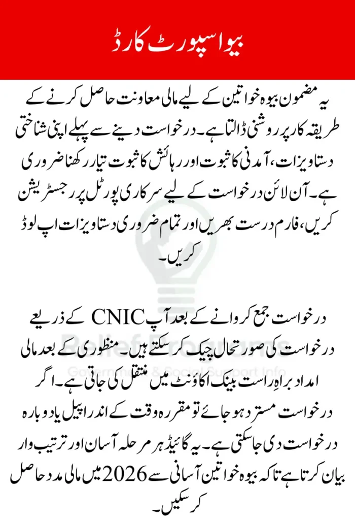 The Bewa Support Card is a government initiative designed to provide financial relief to widows in need. By obtaining this card, eligible applicants can receive up to 1 Lakh PKR, helping them manage household expenses and essential needs.