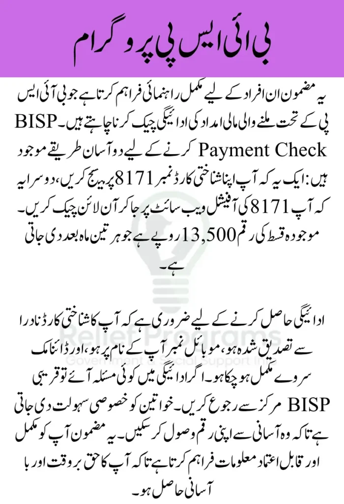 اگر آپ کو اپنی بی آئی ایس پی رقم کی معلومات حاصل کرنی ہے تو سب سے آسان طریقہ یہ ہے کہ اپنا قومی شناختی کارڈ نمبر بغیر کسی وقفے کے 8171 پر بھیجیں۔ آپ کو فوری پیغام کے ذریعے بتایا جائے گا کہ آپ کی ادائیگی کب اور کہاں دستیاب ہے۔ اس طریقہ سے آپ گھر بیٹھے اپنی سہولت سے ادائیگی کی تفصیل معلوم کر سکتے ہیں۔