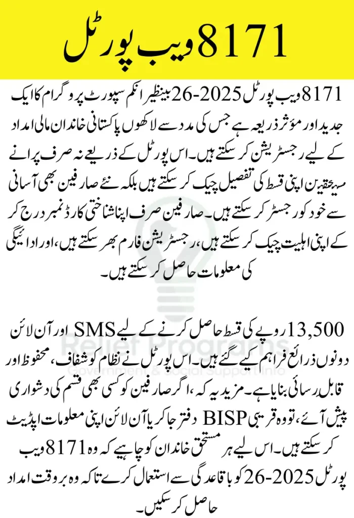 اگر آپ نے پہلے سے BISP میں رجسٹریشن کروائی ہے تو آپ 8171 ویب پورٹل 2025-26 پر لاگ اِن کر کے اپنی قسط، درخواست کا اسٹیٹس، اور دیگر معلومات حاصل کر سکتے ہیں۔ اگر آپ کی معلومات میں کوئی تبدیلی آئی ہو تو وہ بھی آپ اسی پورٹل کے ذریعے اپڈیٹ کر سکتے ہیں۔