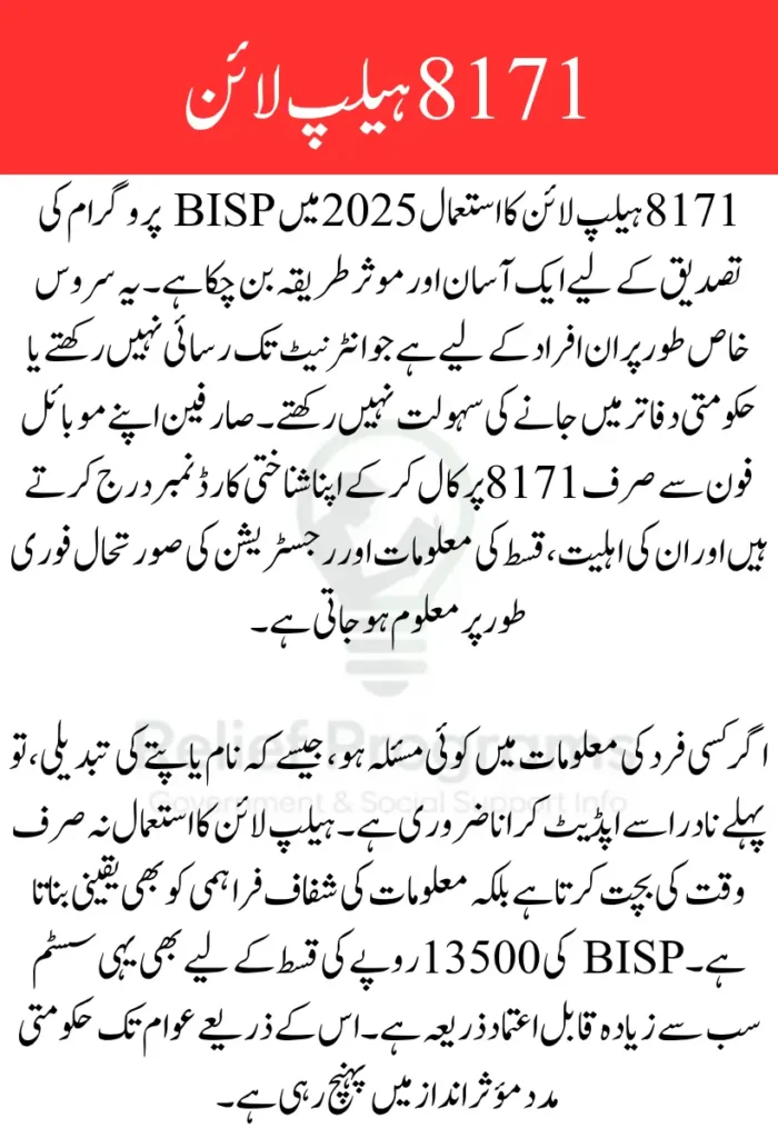 The BISP 8171 web portal offers similar services to the helpline but requires internet access. For rural areas or people without smartphones, the 8171 Helpline remains the easiest and most effective method for checking status and payments.