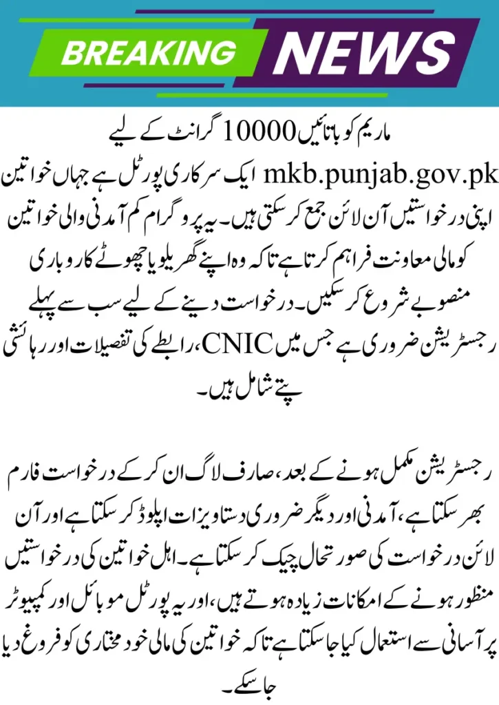 The mkb.punjab.gov.pk portal is the official platform where women in Punjab can apply for the Maryam Ko Batain 10000 grant online. This government initiative provides financial support to women from low-income households, helping them meet essential needs or start small personal projects. This article explains how to register, log in, fill out the application, check eligibility, and track the application status efficiently.