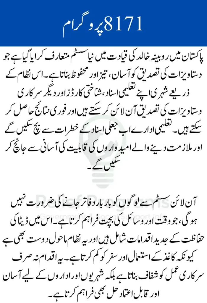 The launch of the New 8171 Document Verification system marks a significant step in modernizing Pakistan’s administrative framework. By providing speed, security, and transparency, it addresses longstanding verification challenges and benefits citizens, institutions, and businesses alike. This initiative reflects a move toward a more efficient and digitally enabled governance model.