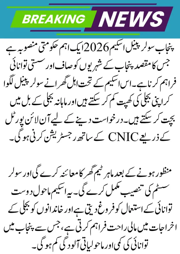 The Punjab Solar Panel Scheme 2026 is a government initiative designed to make renewable energy accessible and affordable for residents of Punjab. This scheme allows eligible households to install solar panels at reduced costs or through easy payment plans, helping families lower electricity bills while promoting sustainable energy use.
