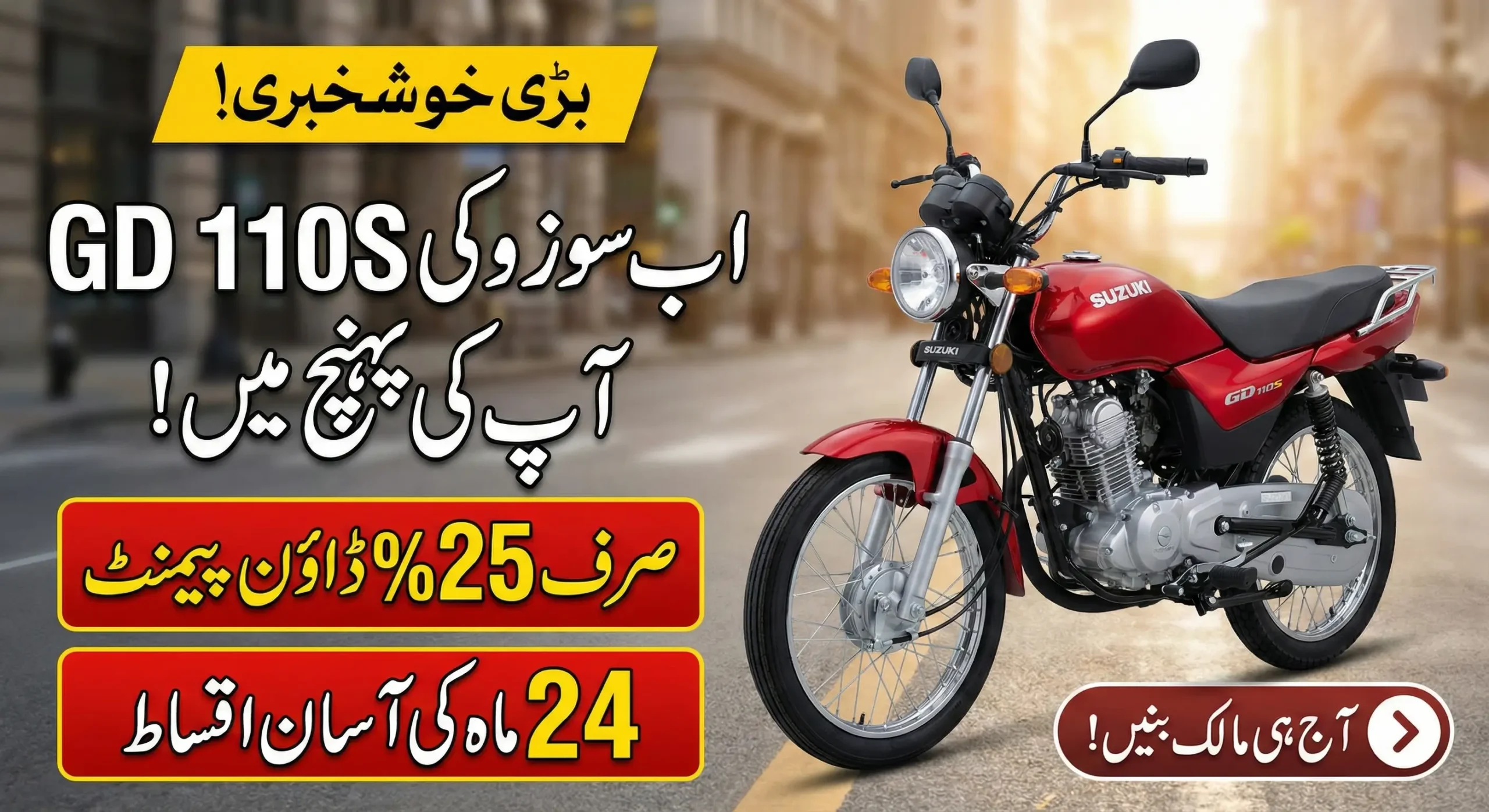 The Suzuki GD 110S Installment Plan in Pakistan allows buyers to purchase a reliable and fuel-efficient motorcycle with a 25% down payment and flexible financing spread over 24 months. This plan is ideal for students, working professionals, and daily commuters who want affordable monthly payments while gaining immediate ownership.