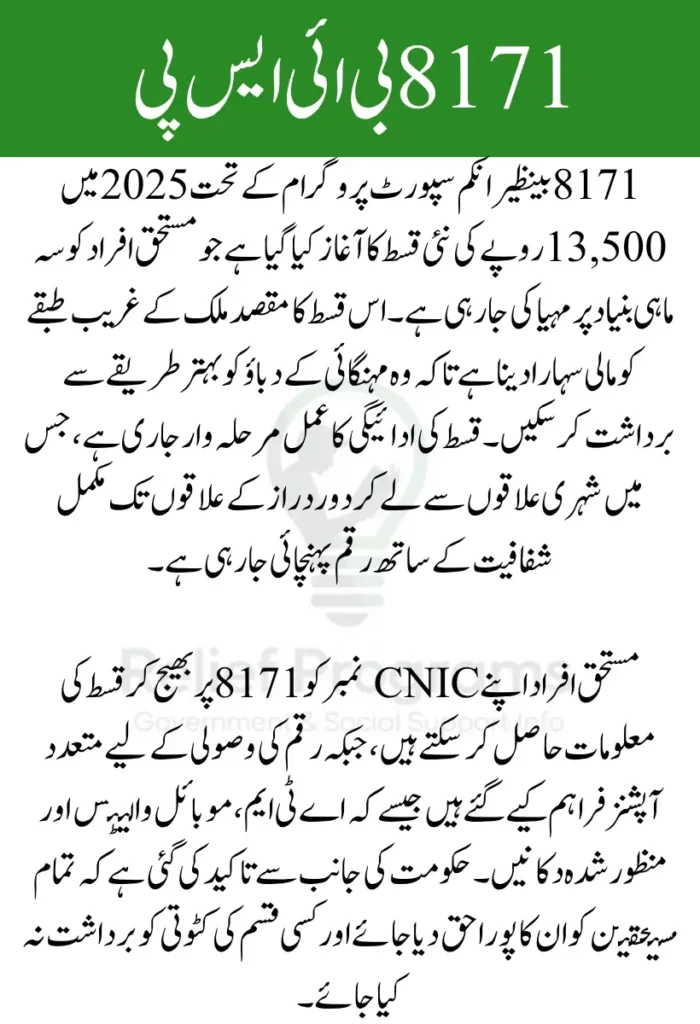 8171 بینظیر انکم سپورٹ پروگرام کے تحت 2025 میں 13,500 روپے کی نئی قسط جاری کی جا رہی ہے۔ یہ رقم غریب اور مستحق خاندانوں کے لیے مختص کی گئی ہے تاکہ وہ مہنگائی کے دور میں بنیادی ضروریات پوری کر سکیں۔ اس قسط کا شیڈول مرحلہ وار ترتیب دیا گیا ہے تاکہ آسانی سے اور منظم طریقے سے رقم کی تقسیم ممکن ہو۔